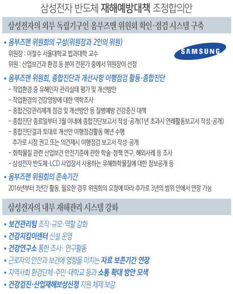 이번에 3자는 조정위의 틀에서 '옴부즈맨위원회'를 구성하기로 했다. 옴부즈맨위원회는 예방대책과 관련해 종합진단과 개선안을 제시하고 이행을 점검하는 역할을 하게 된다. 삼성전자는 그간 옴부즈맨 제도 도입에 대해 반도체 생산 기밀 유출 등을 이유로 난색을 보였다.