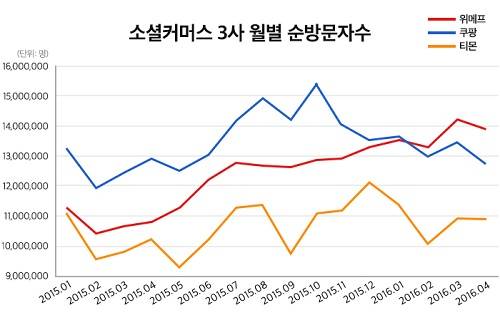 12일 리서치회사 닐슨코리안클릭이 집계한 결과에 따르면 위메프의 월간 전체 순방문자수는 1394만명으로 쿠팡(1276만명)과 티켓몬스터(1095만명)에 앞선 것으로 나타났다.