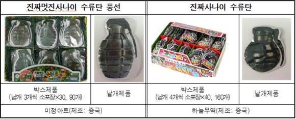 한국소비자원은 문구점에서 구입한 수류탄 모양 완구가 갑자기 터져 폭발음으로 인해 귀가 아프다는 사례가 접수돼 시험을 진행한 결과, 소음이 기준치를 넘어 판매 중단 및 회수하기로 했다고 19일 밝혔다.