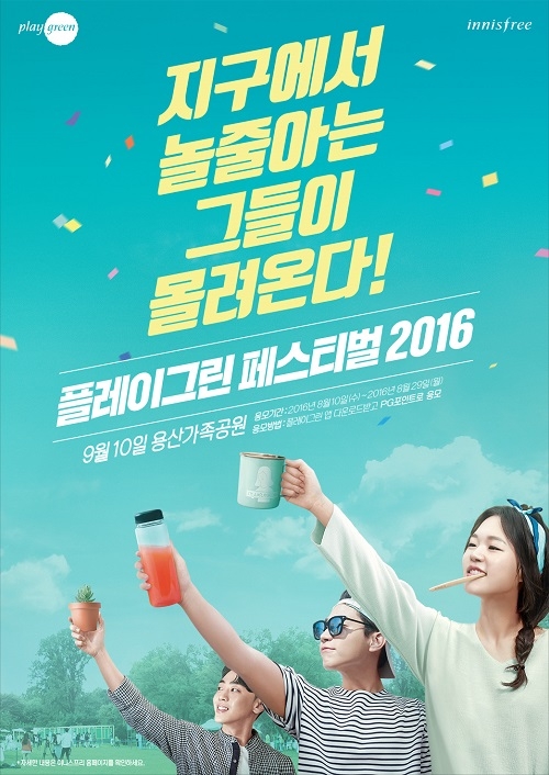 [시사뉴스 조아라 기자] 이니스프리가 9월10일 서울 용산가족공원에서 그린라이프를 실천하는 플레이그리너를 위한 ‘플레이그린 페스티벌 2016’을 개최한다.