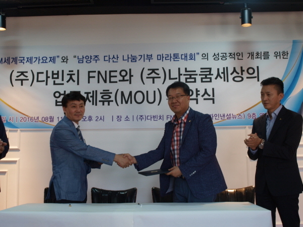 ㈜다빈치 FNE(대표 이성채)는 지난 9일 한류문화연예엔터테인먼트 컨텐츠기획사 ㈜나눔쿰세상과 “WM세계국제가요제와 남양주 다산 나눔기부 마라톤대회 성공적인 개최를 위한 업무협약”을 체결했다고 밝혔다.