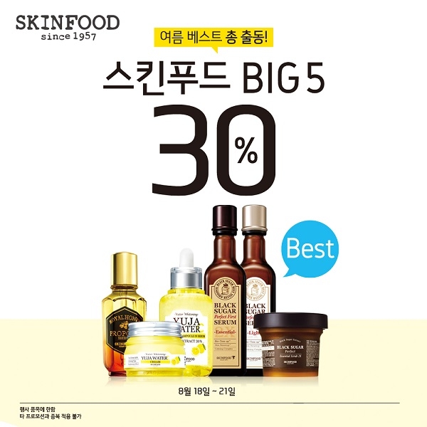 [시사뉴스 조아라 기자] 뷰티 브랜드 스킨푸드가 오는 21일까지 ‘블랙슈가 퍼펙트 첫세럼’, ‘로열허니 프로폴리스 에센스’ 등 베스트5 상품을 30% 할인하는 행사를 진행한다.