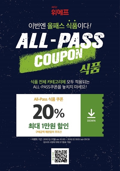 위메프는 또한 17일부터 18일까지 이틀간 ‘ALL-PASS 식품’ 할인 쿠폰 이벤트를 진행한다. 이번 ‘ALL-PASS 식품’ 할인 쿠폰 이벤트는 식품 카테고리 모든 상품을 대상으로 20%, 최대 1만원 할인이 적용된다. 뒤 이어 이틀에 한 번씩 카테고리별 ALL-PASS 쿠폰을 차례로 선보일 예정이다.