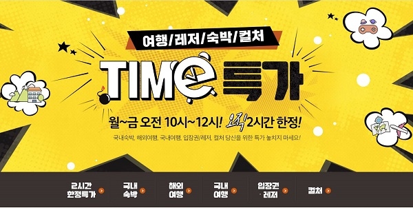투어타임특가 기획전은 월요일부터 금요일까지 매일 오전 10시부터 2시간동안 진행된다. 숙박 입장권 국내여행 항공권 해외여행 문화 등 위메프에서 판매중인 상품들 중 매일 2시간동안 3~6개의 특가 상품을 선보인다.