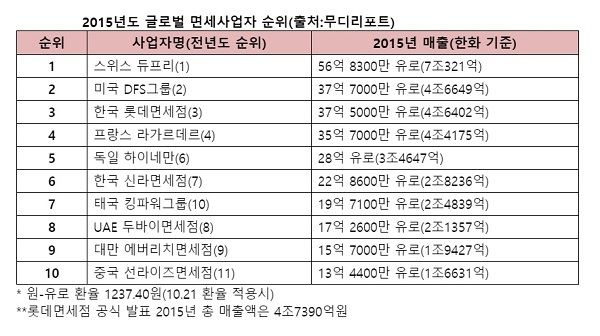 롯데면세점은 2014년도 2위 DFS와 2억1500만유로의 차이를 보였으나 2015년도에는 이 간격을 2000만유로(한화 기준 250억여원)로 바짝 좁혔다. 신라면세점의 경우 22억8600만유로로 전년도 7위(18억7700만유로)에서 6위로 한 계단 상승했다.