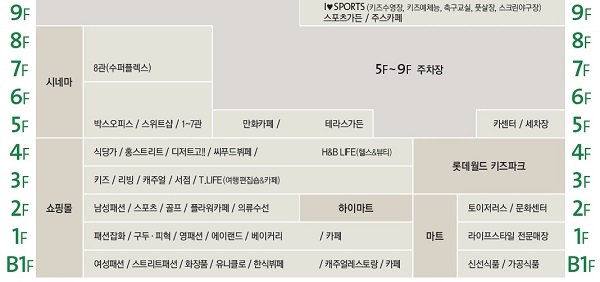 쇼핑몰은 영업면적 4만여㎡(1만2295평) 규모로 지하 1층부터 지상 4층(9층 ‘I♥Sports’ 입점)으로 글로벌SPA부터 씨푸드뷔페까지 총 201개 브랜드를 선보인다. 또 마트는 지하 1층부터 지상 2층까지 3개 층에 영업면적 약 9385㎡(2839여평) 규모로 들어서며 ‘문화센터’를 포함해 체험형 장난감 전문매장인 ‘토이저러스’와 가전 전문매장 ‘하이마트’ 등이 입점한다. 시네마는 8개관 1336석의 최신시설로 들어설 예정이다.
