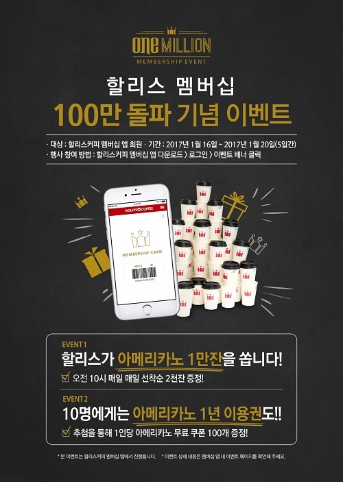 이지은 할리스커피 마케팅본부 이사는 “이번 이벤트는 할리스커피 멤버 100만명 돌파를 기념하고, 지난 19년간 보내주신 고객들의 성원에 보답하기 위해 특별 기획됐다”며 “앞으로도 더 많은 고객들이 할리스커피를 경험할 수 있는 다양한 이벤트를 마련할 것”이라고 말했다.