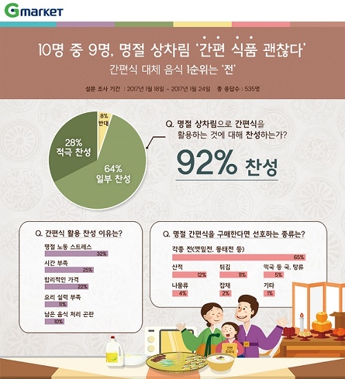 G마켓이 설 명절을 앞 둔 지난 18일부터 24일까지 총 535명의 고객을 대상으로 설문조사를 실시한 결과, 응답자의 92%가 ‘명절 상차림으로 간편식을 활용하는 것에 찬성한다’고 답했다. 세부적으로는 28%가 명절 음식에 간편식 활용을 적극 찬성한다고 답했고, 64%는 일부 찬성하며, 직접 요리하는 음식과 적당히 섞어 활용할 수 있다고 답했다.
