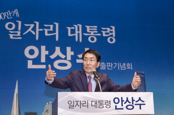 안 의원은 이날 오후 서울 여의도 중소기업중앙회 그랜드홀에서 열린 ‘일자리 대통령’출판기념회에서 “이제는 과거와 같이 투자와 경제성장으로 일자리를 만드는 시대는 끝났다”이같이 밝혔다.