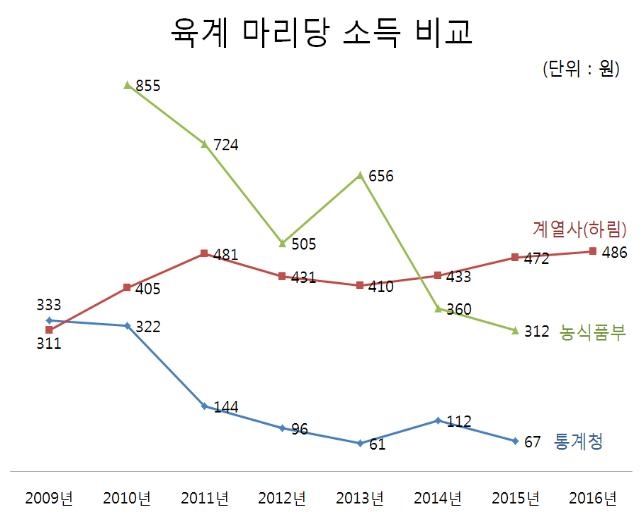 특히 통계청과 농식품부 육계마리당 소득 통계는 가파른 하락세를 보이고 있지만 계열사 사육비는 안정적인 추세를 지속하고 있는 것으로 나타났다.