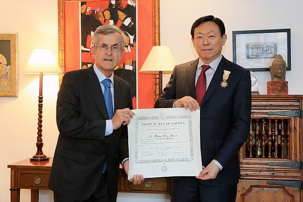 [시사뉴스 조아라 기자] 신동빈 롯데그룹 회장이 지난 18일 한국과 스페인 양국 간 관계 강화에 기여한 공로로 펠리페 6세 스페인 국왕이 수여하는 훈장인 ‘이사벨 여왕 십자문화대훈장(The Cross of Official of the Order Isabel La Catolica)’을 받았다.
