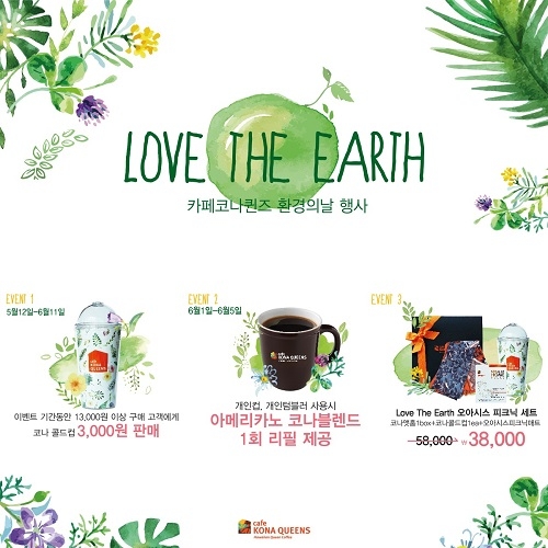 [시사뉴스 조아라 기자] 커피 전문점 ‘카페 코나퀸즈’가 세계 환경의 날을 맞아 환경오염의 주 원인이 되는 일회용품 사용을 줄이기 위해 ‘러브 디 얼스(LOVE THE EARTH)’ 프로모션을 실시한다.