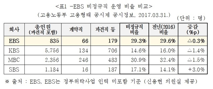 국회 과학기술정보방송통신위원회 신용현(국민의당) 의원이 26일 한국교육방송공사로부터 제출받은 자료에 따르면, 2017년 3월 기준 EBS의 전체 인원 835명 중 계약직과 파견직 등을 포함한 245명이 비정규직 근로자로 전체 인원 중 비정규직 비율은 29.3%인 것으로 확인됐다.