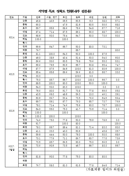 국회 환경노동위원회 임이자 의원(자유한국당, 경기 안산 단원을 당협위원장)이 기상청으로부터 제출받은 국정감사 자료에 따르면 폭염특보 정확도는 2014년 81.1%, 2015년 76.2%, 2016년 78.1%, 올해 7월말까지 72.7%로 2년 7개월새 8.4%나 하락했다.