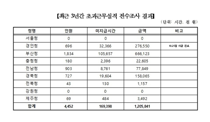 가장 많은 시간을 누락한 곳은 부산청으로 나타났으며 전남청, 경북청이 그 뒤를 이었다. 우정사업본부는 지난달 국회 국정감사에서 신창현 의원이 경인청의 초과근로시간 조작 문제를 제기하자 최근 3년간의 초과근로시간을 전수조사하여 그 결과를 발표했다.