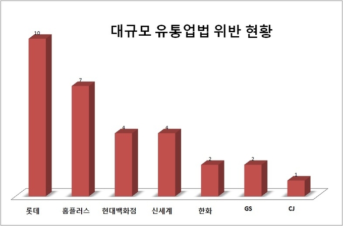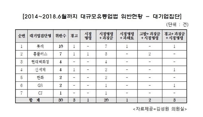 국회 정무위원회 김성원 의원(자유한국당, 경기 동두천‧연천)이 공정거래위원회로부터 제출받은 「2014년부터 2018년 6월까지 대규모유통업법 위반현황」에 따르면, 롯데, 신세계, 현대백화점 등 대규모 유통업체들의 법 위반행위가 끊이지 않고 매년 반복되고 있는 것으로 나타났다.