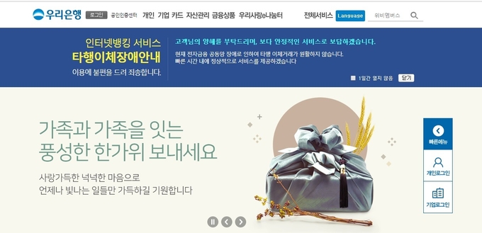 [시사뉴스 강민재 기자] 우리은행 인터넷뱅킹 이체 서비스가 21일 오류로 한 때 중단된 탓에 추석을 앞둔 고객들이 불편을 겪었다. 우리은행측은 완전한 복구가 이루어 졌다고 하나 현재도 일부 이용자들은 불안정한 상태로 불편을 호소하고 있는 상황이다.