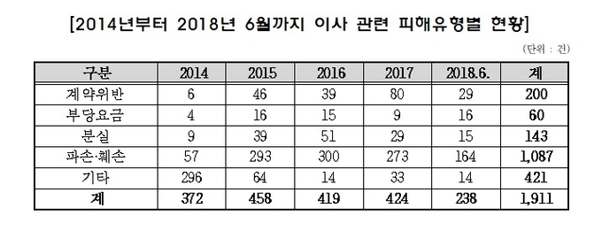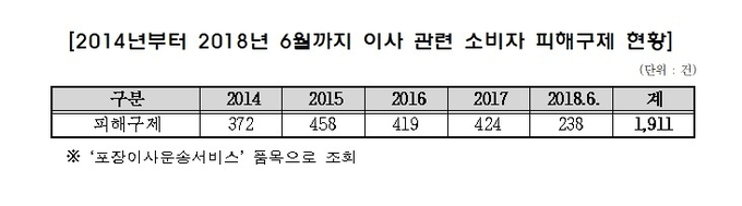 국회 정무위원회 김성원 국회의원(자유한국당, 경기 동두천‧연천)이 한국소비자원(이하 소비자원)으로부터 제출받은 「2014년부터 2018년 6월까지 포장이사 피해 현황」을 분석한 결과, 2013년 372건에서 2018년 238건(6월까지 기준)까지 총 1,911건의 소비자 피해가 접수되면서 매년 급증하는 것으로 나타났다.