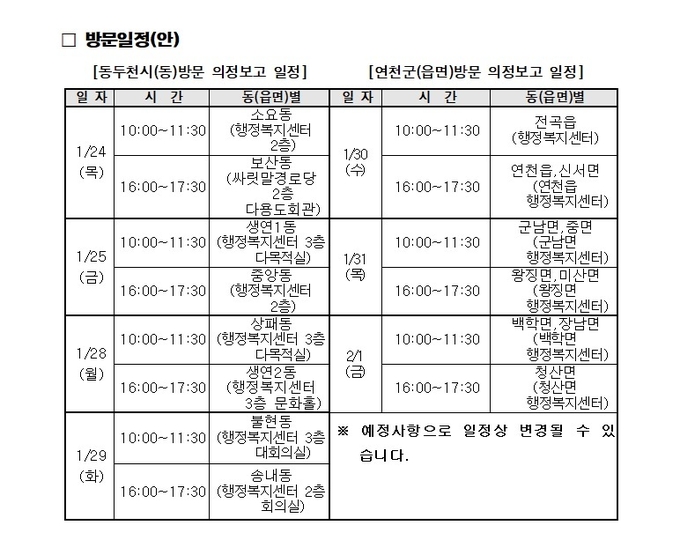 이번 의정보고회는 1월 24일(목) 소요동과 보산동을 시작으로 △25일(금) 생연1동, 중앙동 △28일(월) 상패동, 생연2동 △29일(화) 불현동, 송내동 △30일(수) 전곡읍, 연천읍, 신서면 △31일(목) 군남면, 중면, 왕진면, 미산면 △2월 1일(금) 백학면, 장남면, 청산면 등에서 개최할 예정이다. 이번 지역밀착형 의정보고회를 통해 지난해 국회 정무위원회, 예산결산특별위원회 등의 각종 상임위원회 활동과 연천·동두천 숙원사업 해결을 위한 예산확보, 사업추진경과에 대해 소상하게 설명할 예정이다.