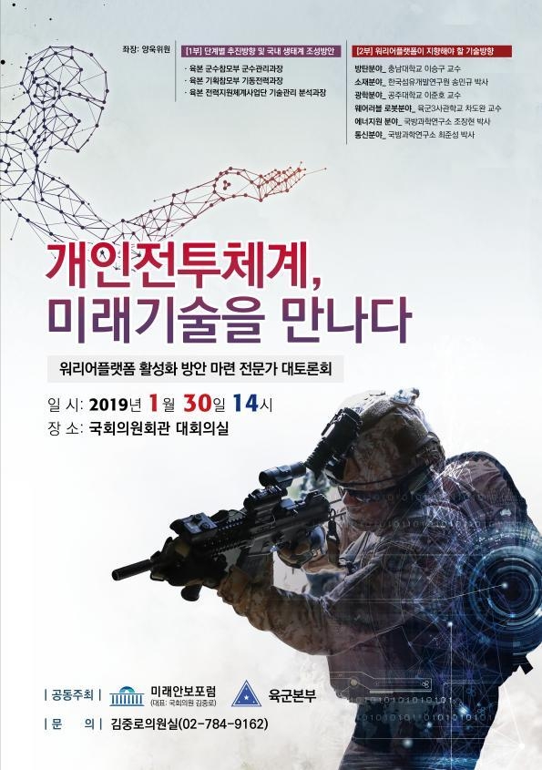 국회 국방위원회 김중로의원(바른미래당)이 대표의원으로 있는 국회 미래안보포럼은 지난해 대토론회 전시회에 이어 올해도 육군본부와 공동 주관으 30일(수) 국회의원회관 대회의실에서 ‘개인전투체계, 미래기술을만나다 – 워리어플랫폼 활성화 방안 마련 전문가 대토론회’ 를 개최한다고 밝혔다.