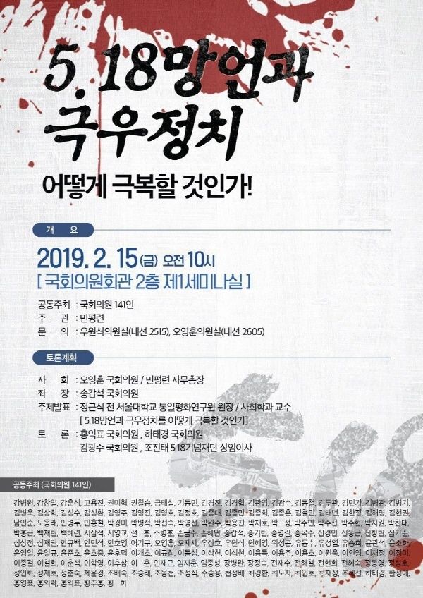정근식 전 서울대학교 통일평화연구원 원장이‘5.18망언과 극우정치를 어떻게 극복할 것인가’라는 주제로 발표하고, 더불어민주당 홍익표 의원, 바른미래당 하태경 의원, 민주평화당 김광수 의원, 조진태 5.18기념재단 상임이사가 토론을 이어갈 예정이다.
