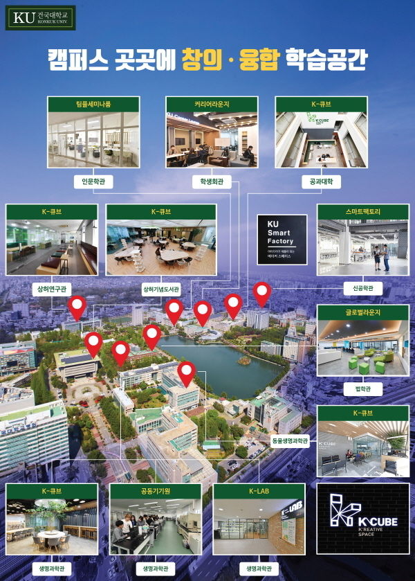 이에 따라 건국대 캠퍼스 ‘K-큐브’는 상허기념도서관(1100m²), 공학관(1200m²), 생명과학관(287m²), 상허연구관(400m²), 동물생명과학관(186m²) 등 총 5곳으로 확대됐다. 학생들의 창작·창업을 위한 메이커스페이스인 신공학관 ‘스마트 팩토리’와 학생회관의 ‘커리어라운지’, 법학관의 ‘글로벌라운지’, 인문학관 ‘팀플세미나룸’, 생명과학관 ‘K-랩’ 등 캠퍼스 곳곳에 학생들을 위한 학습-휴게 공간 10여곳도 마련됐다.