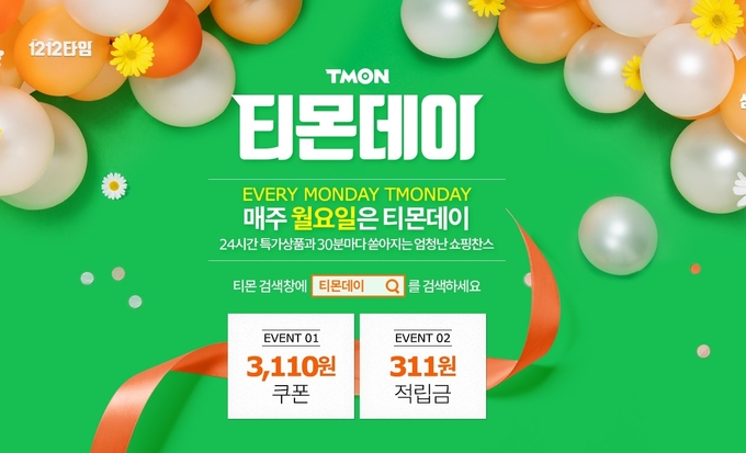 [시사뉴스 김성훈 기자] 소셜커머스 티몬이 오늘(11일) 티몬데이를 시작했다. 티몬데이는 매주 월요일 24시간 동안 티몬에서 진행하는 할인행사이다. 옵션상품 별 추가 금액 없이 균일가로 지정 제품을 구매할 수 있으며 전상품 무료배송으로 진행된다. 매 시각 정각 초특가 상품을 판매한다. 또한 매 시각 30분 선착순 쿠폰을 지급한다.