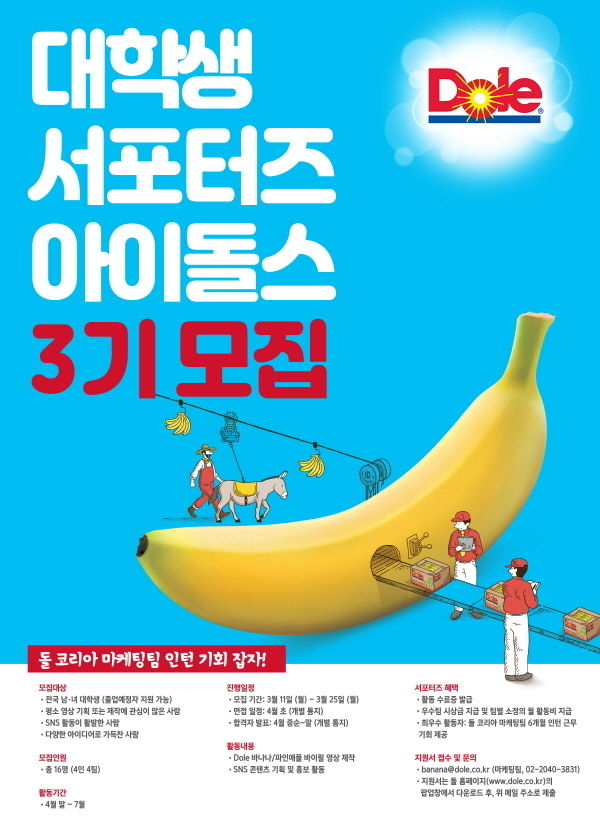 [시사뉴스 김성훈 기자] 세계적인 청과회사 돌(Dole) 코리아(대표이사 리차드 웨인 토만)가 대학생 서포터즈 ‘아이돌스(I-Doles)’ 3기를 모집한다.