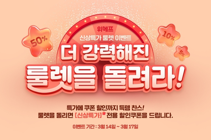 [시사뉴스 김성훈 기자] 위메프가 읶메뜨에 이어 14~17일 '신상특가' 행사를 통해 '100% 당첨 룰렛 이벤트'를 진행한다.