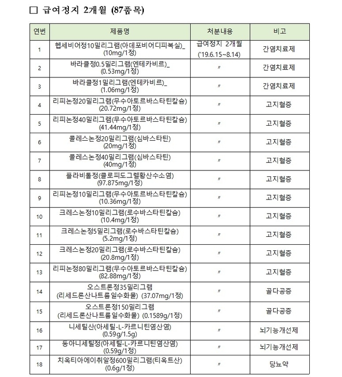 나머지 37개 품목에 대해서는 환자군이 약물변화에 민감하게 반응해 건강과 생명에 심각한 영향이 우려되거나 급여정지 실효성이 없어 과징금으로 대체된다.