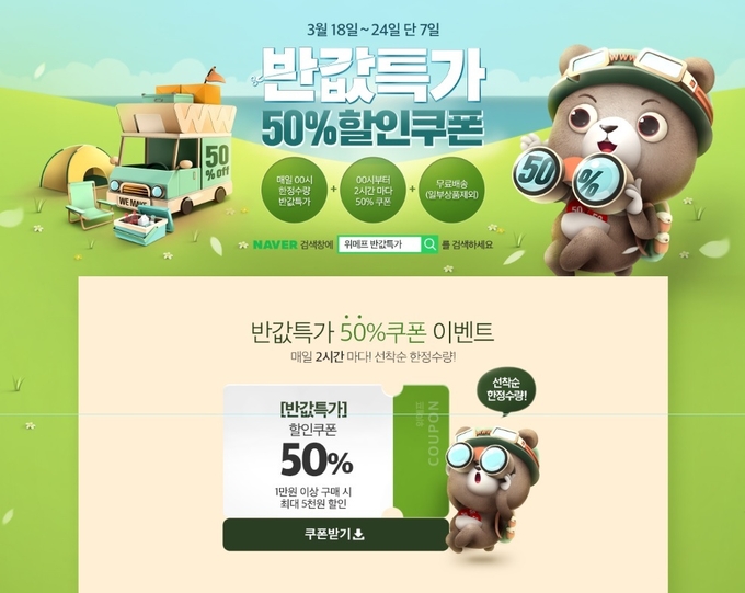 이벤트 내용은 매일 0시 한정수량 반값특가와 2시간마다 1만원 이상 구매시 최대 5천원 할인되는 50% 할인 쿠폰을 지급한다. 50% 할인쿠폰은 당급 당일에 사용해야 한다. 또한 무료배송도 포함된다.