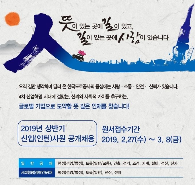 [시사뉴스 김성훈 기자] 한국도로공사의 2019년 상반기 신입(인턴)사원 공개채용 필기 응시대상자가 18일 한국도로공사 채용 홈페이지를 통해 공고됐다.