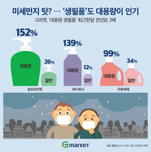 또한 대용량 바디워시가 139%, 대용량 샴푸린스는 75% 신장했다. 대용량 세제 품목의 인기도 높아졌는데, 대용량 주방세제 판매는 99%, 대용량 세탁세제 판매는 42%가 늘었다. 대용량 손세정제도 45% 판매량이 신장했다. 이외에도 대표적인 미세먼지 방지용품인 ‘마스크’ 역시 100매 이상 대용량으로 구입하는 이들이 늘면서 같은 기간 대용량 마스크 판매가 무려 70배 이상(7375%) 급증했다.