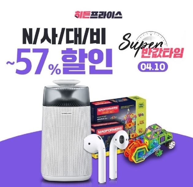 히든프라이스는 추첨을 통해 에어팟 7만9천원, 삼성 블루스카이 공기청정기 12만9천원, 맥포머스 스팀 마스터 304P세트는 14만9천원에 구입할 수 있는 '슈퍼반값쿠폰'을 증정한다.