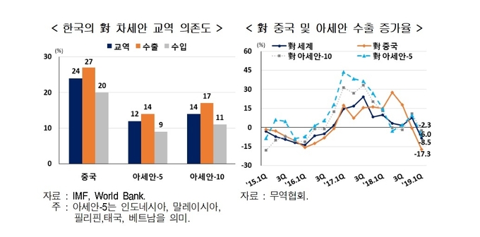 이에 따라 ‘차세안’ 무역 의존도가 높은 한국 수출에도 빨간불이 켜졌다는 게 보고서의 분석이다. 우리나라는 차세안에 대한 교역 의존도가 38%로 나타났다. 2018년 한국의 차세안에 대한 수출 의존도는 43.3%, 수입 의존도는 31.0%로 높은 수준을 보인다. 여기에 한국의 대 차세안 해외 직접 투자 비중은 22%이다. 차세안 금융시장에 대한 한국 노출도는 20%이다. 즉 차세안 리스크 발생시 국내로 전이될 가능성이 존재한다.