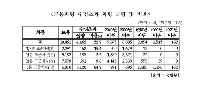 1¼톤 차량과 2½톤 차량의 수명초과 비율이 각각 3.6%와 9.8% 수준인 것에 비하면 5톤 차량의 노후화 비율은 심각한 수준이다. 현재 운용 중인 5톤 차량 중 1990년대에 제작된 차량은 1,485대(30.9%)이고, 1980년대는 1,476대(30.7%), 1970년대에 제작돼 운용 중인 차량도 162대에 이른다.