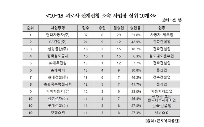 사업장별로는 현대자동차(울산·전주·아산 공장)이 37건(8건 승인)으로 가장 많았고, GS건설 21건(9건 승인), 삼성물산 18건(3건 승인), 한국철도공사 16건(1건 승인), 대우건설 13건(1건 승인)이 그 뒤를 이었다.