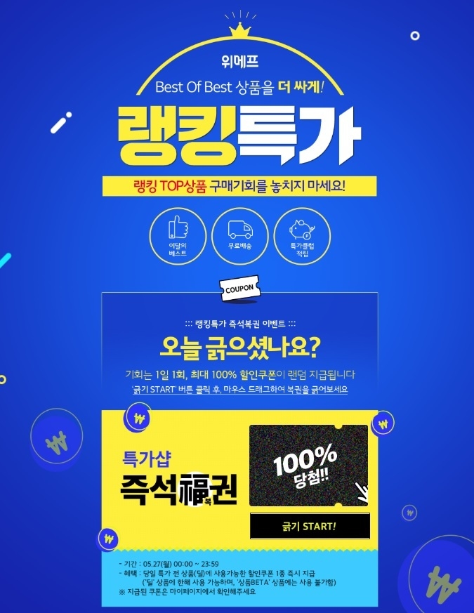 이번 이벤트는 이날부터 오는 31일까지 5일동안 베스트 상품을 할인받을 수 있는 100% 할인 쿠폰을 1일 1회 랜덤으로 지급한다.