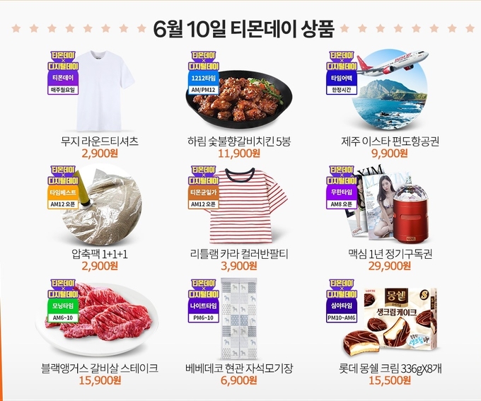 10일 하루 동안 네이버에서 '티몬데이'를 검색하고 상단에 보이는 브랜드 검색 배너를 클릭하면 2시간마다 선착순 3천명에게 1천원 쿠폰을 발급한다. 3대 카드사(국민, 삼성, 우리)로 결제하게 되면 3만원 이상 구매시 3천원 할인도 받을 수 있다.