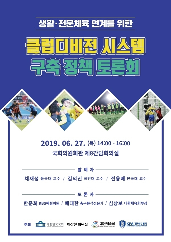 [시사뉴스 강민재 기자] 더불어민주당 이상헌 국회의원은 오는 6월 27일 국회 의원회관 제 8간담회의실에서 대한체육회·대한축구협회와 공동으로 프로와 아마추어 리그 통합을 위한 클럽디비전 시스템 구축 토론회를 진행한다고 밝혔다.