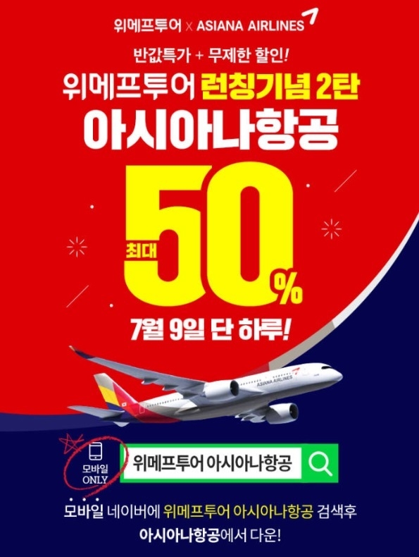 [시사뉴스 김성훈 기자] 위메프는 9일 위메프투어 출시 기념 행사 '투어위크'출시를 기념해 아시아나항공 이용권 7%할인 프로모션을 실시한다.