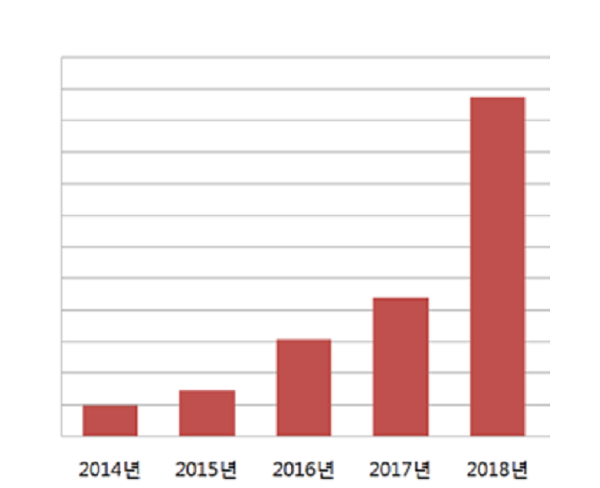 2014년부터 2017년까지 각각 5.6%, 18.1%, 12.5%에 불과하던 증가폭이 2018년에는 53.6%로 크게 증가했다.