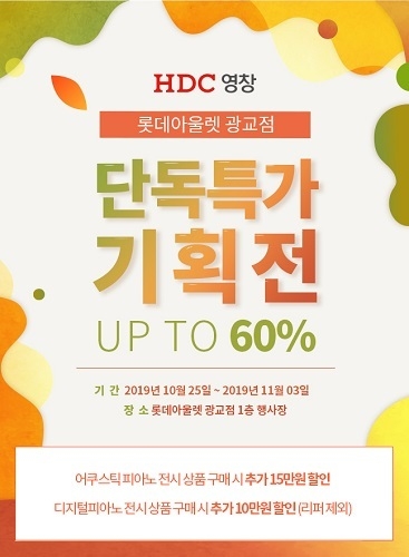 이번 행사의 진행 기간은 오늘 10월25일(금)부터 11월 03일(일)까지이며, HDC영창에서 공식인증하는 중고피아노, 디지털피아노 및 전자피아노, 신디사이저의 파격 특가와 더불어 최대 63%를 할인하는 디지털피아노 단독 리퍼 전을 개최한다. 신디사이저 및 스테이지 피아노는 필수로 여기는 고가의 패키지를 무료로 증정한다고 밝혔다.