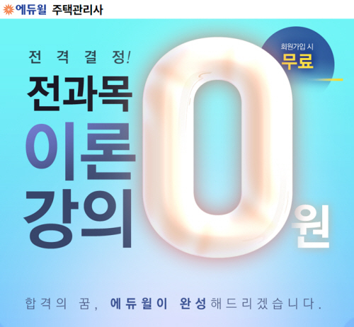 [시사뉴스 윤호영 기자] 종합교육기업 에듀윌(대표 박명규)은 주택관리사 초보수험생을 위해 ‘전과목 이론강의 0원’ 이벤트를 마련하고 수강생을 모집하고 있다.