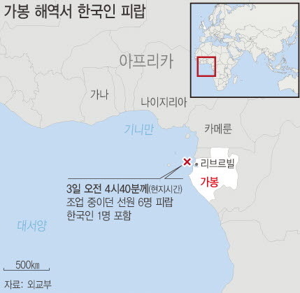 [시사뉴스 강민재 기자] 서아프리카 가봉 수도 리브르빌 인근 해역에서 3일(현지시간) 어선 2척이 해적 추정 세력의 공격을 받아 한국인 1명 등 선원 6명이 피랍됐다.