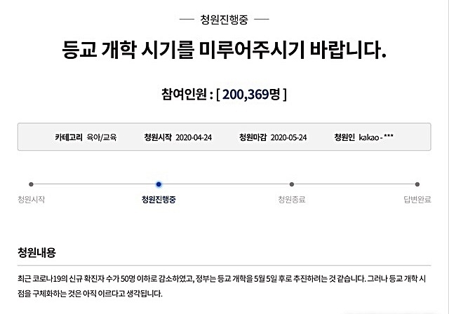 이 청원은 초·중·고등학교의 순차적 온라인 개학만 진행한 채 등교개학 논의가 본격적으로 실시되기 전 이미 게재됐다.