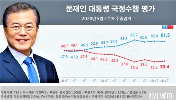 18일 리얼미터가 YTN 의뢰로 실시한 5월 2주차 주간집계(11~15일)에 따르면 전체 응답자의 61.7%(매우 잘함 41.4%, 잘하는 편 20.3%)가 문재인 대통령이 국정수행(국정 지지율)을 잘하고 있다고 답했다. 지난주 대비 0.3%포인트 내렸다.