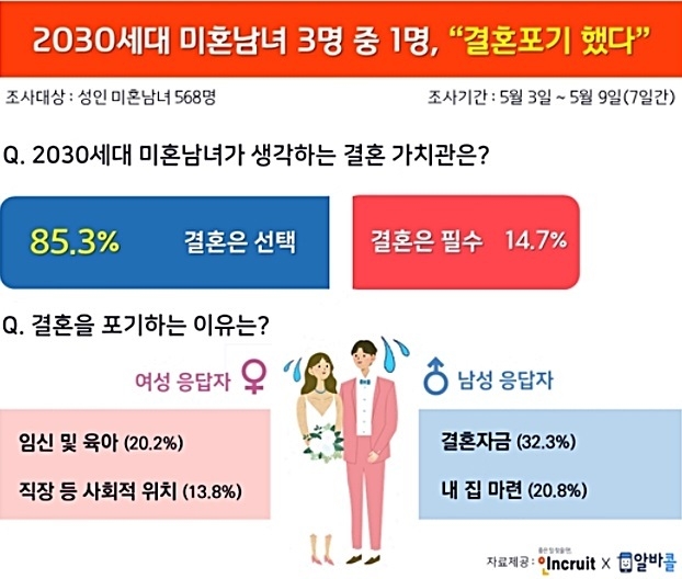 취업포털 인크루트와 알바앱 알바콜은 부부의 날을 맞아 최근 공동 조사한 '결혼가치관 설문조사'(성인 미혼남녀 568명이 참여) 결과를 21일 발표했다.