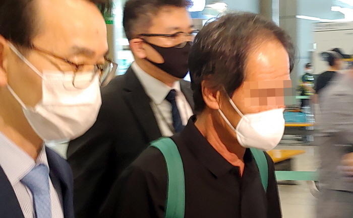검정색 티셔츠 차림에 어께에는 진녹색 가방을 멘 그는 흰색 마스크를 쓰고 외교부 직원 2명과 함께 취재진 앞에 섰다.