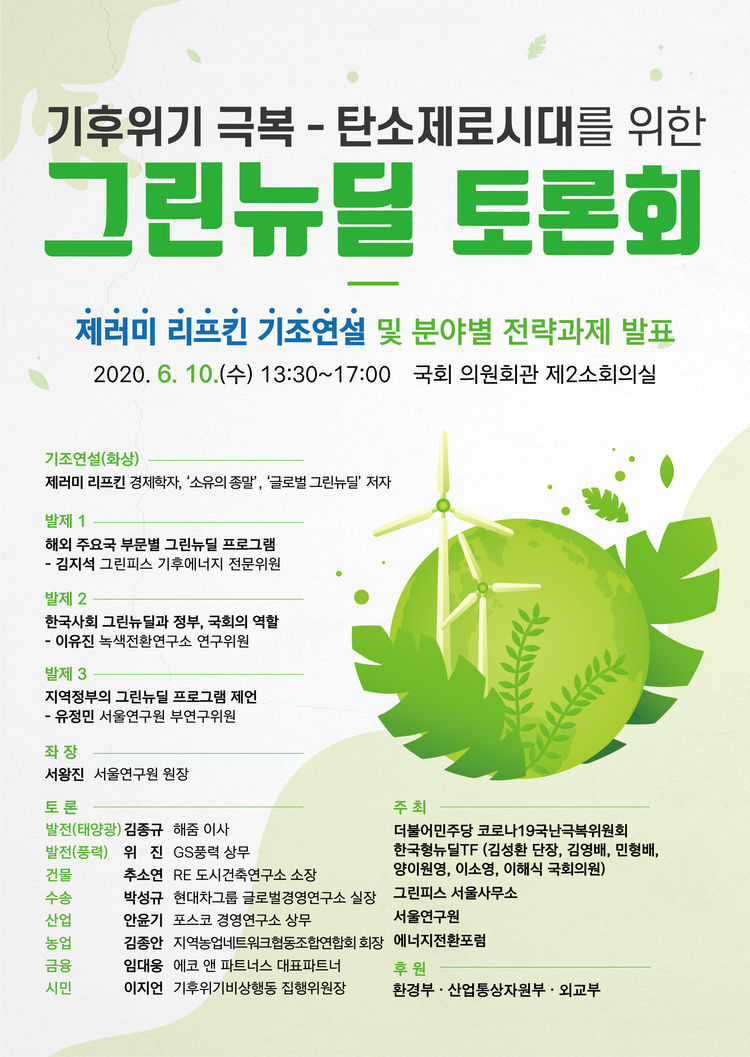토론회를 주최한 김성환 의원은 “탄소제로사회로 전환하기 위해 민주당이 정부와 협의하여 적극적으로 그린뉴딜 정책을 주도하고 제안할 예정”이라고 강조했다. “7월 중 발표 예정인 그린뉴딜 종합대책으로 기후위기와 경제위기를 동시에 극복할 수 있는 기반을 만들 예정이며, 제러미 리프킨의 전망대로 우리나라가 이제는 추격형 국가가 아닌 선도형 국가로 거듭나는 계기를 만들 것”이라고 강조했다.